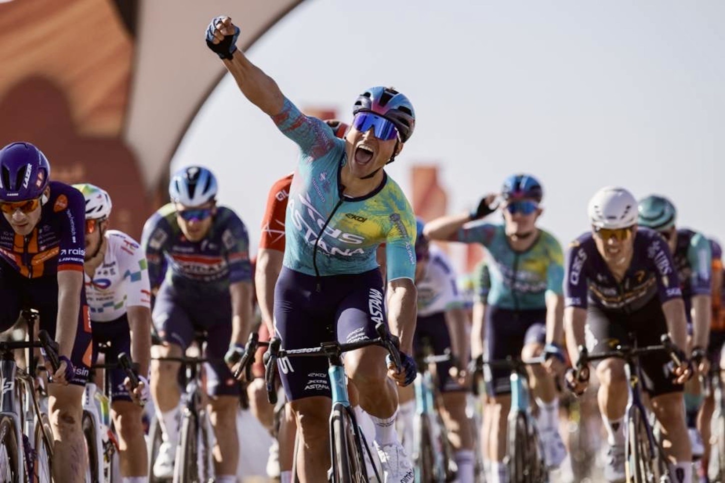 Matteo Malucelli (XDS-Astana) overhauled Jonathan Milan (Lidl-Trek) during the closing meters to claim stage 4 of the AlUla Tour in Shalal Sijyat Rocks today.