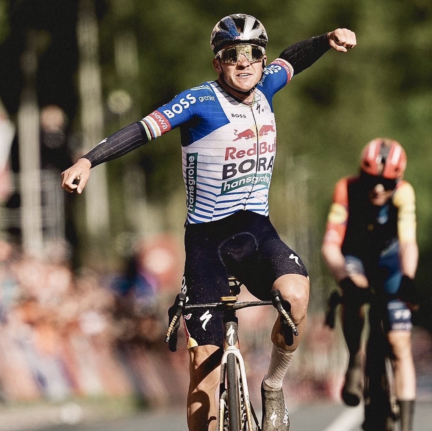 Remco Evenepoel (Red Bull-Bora-Hansgrohe) took an emphatic win in today’s Amstel Gold Race, after the Belgian rider vanquished defending champion Mattias Skjelmose (Lidl-Trek) in a two-man sprint after the final summit of the Cauberg.