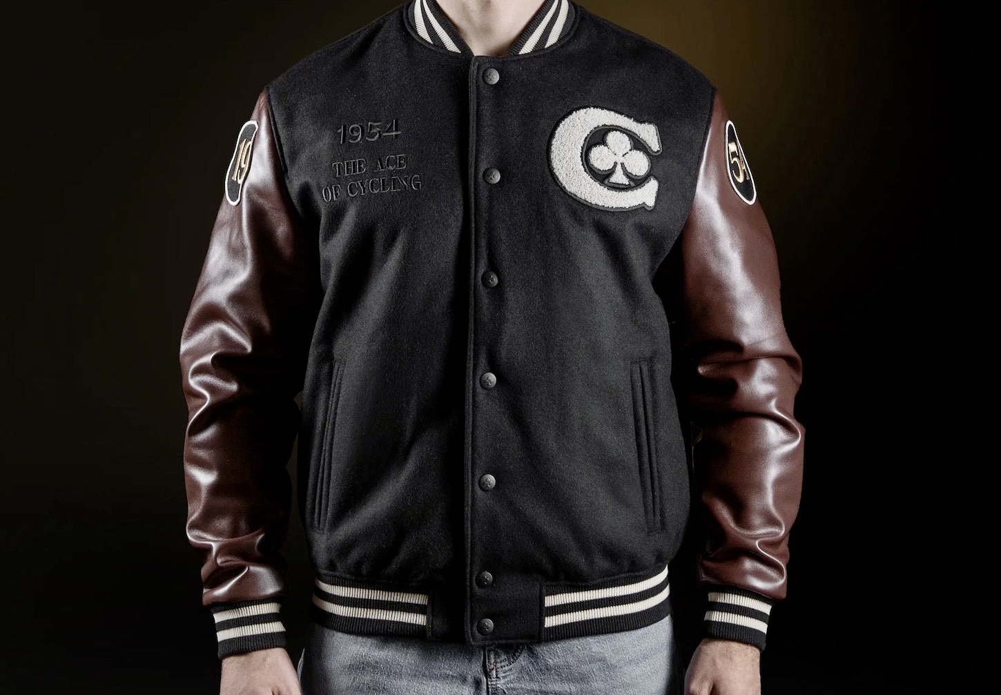 Indeed, the varsity jacket in wool and cashmere blend with embellished logos and patches recalls Colnago’s heritage, while logo buttons and a jacquard lining with Colnago pattern complete this exclusive and refined garment.