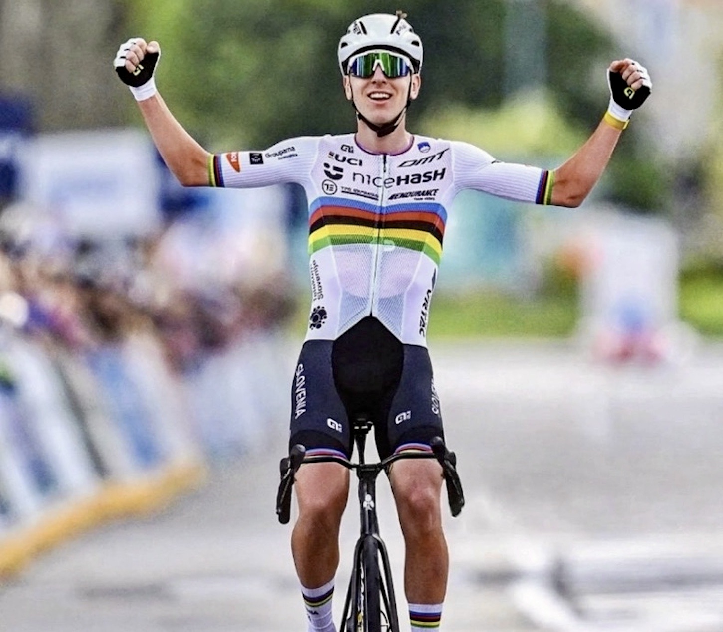 Tadej Pogacar produced a 75-kilometer solo attack that earned the Slovenian rider the victory in today’s European Championships Elite Men’s road race with another dominant display, leaving Remco Evenepoel unable to follow his rival’s attack once again.