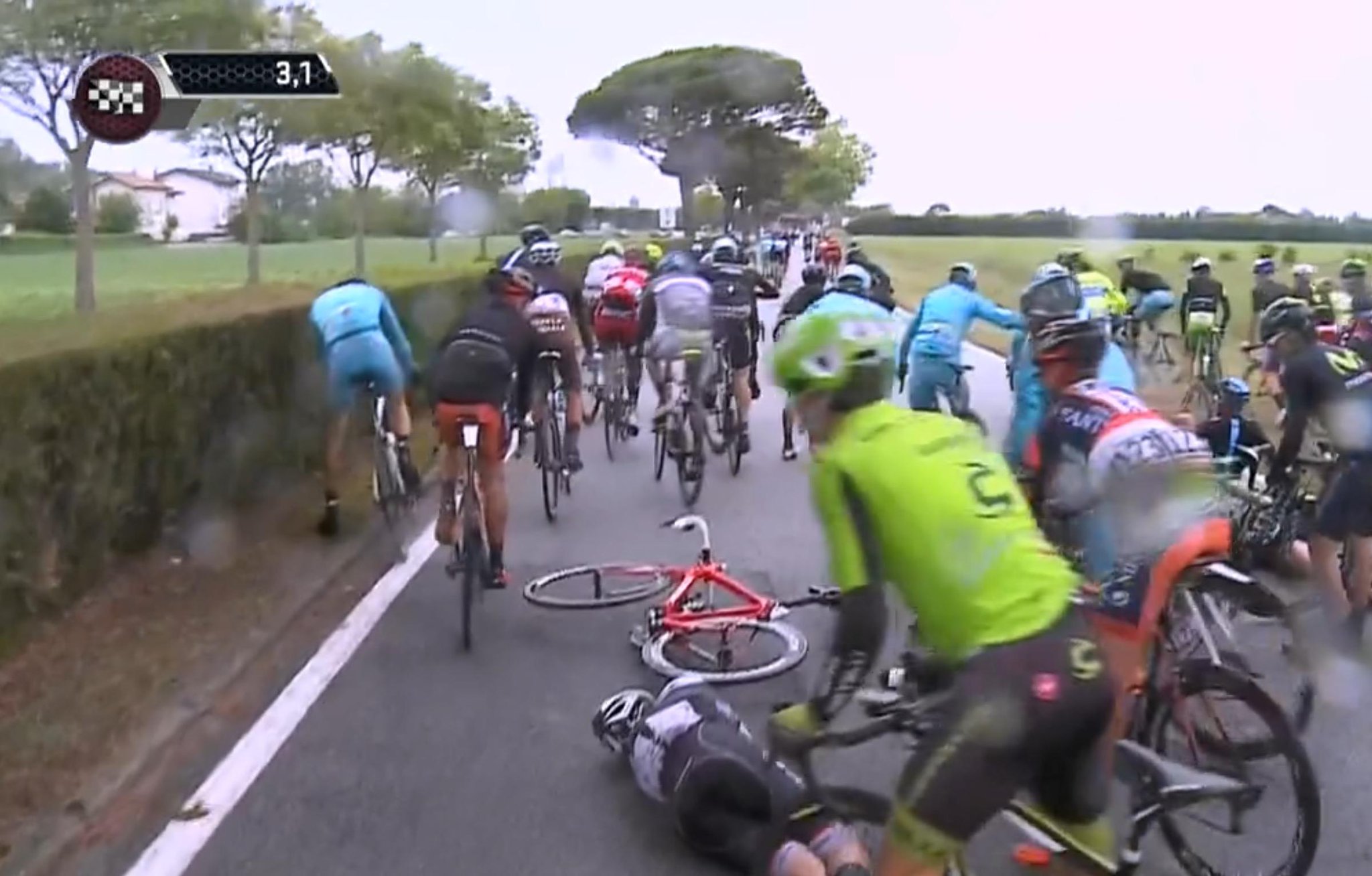 Meanwhile, a massive crash plagued the peloton during the final 3 kilometers, claiming Albert Contador as one of its victims.