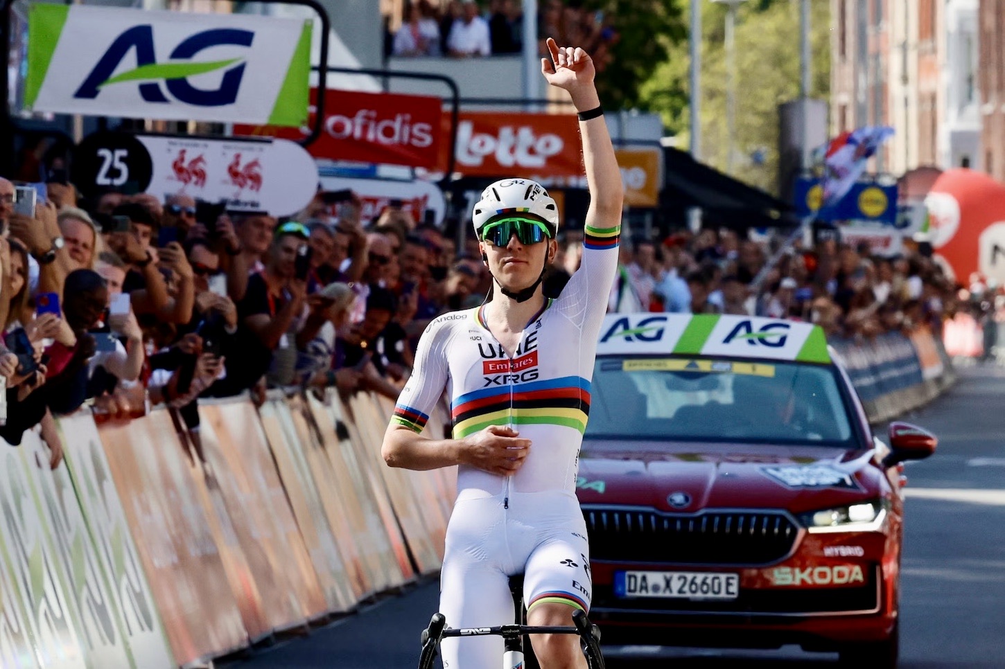 From that point on, Pogačar steadily increased his margin over Seixas, later pointing a finger to the sky in loving memory of his former teammate Cristian Camilo Muñoz, who passed away two days before today’s race, as he crossed the finish in solo fashion.