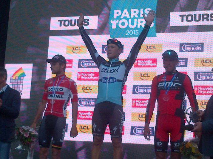 Paris-Tours 2015 Results ITA 1 TRENTIN, Matteo (ETIXX – QUICK STEP) 4:39:12 BEL 2 VAN DER SANDE, Tosh (LOTTO SOUDAL) BEL 3 VAN AVERMAET, Greg (BMC RACING) + 4 BEL 4 BENOOT, Tiesj (LOTTO SOUDAL) + 20 BEL 5 JANS, Roy (WANTY – GROUPE GOBERT) BEL 6 LAMPAERT, Yves (ETIXX – QUICK STEP) AUS 7 HAUSSLER, Heinrich (IAM CYCLING) BEL 8 THEUNS, Edward (TOPSPORT VLAANDEREN – BALOISE) NED 9 TEUNISSEN, Mike (LOTTO NL – JUMBO) NED 10 LIGTHART, Pim (LOTTO SOUDAL)