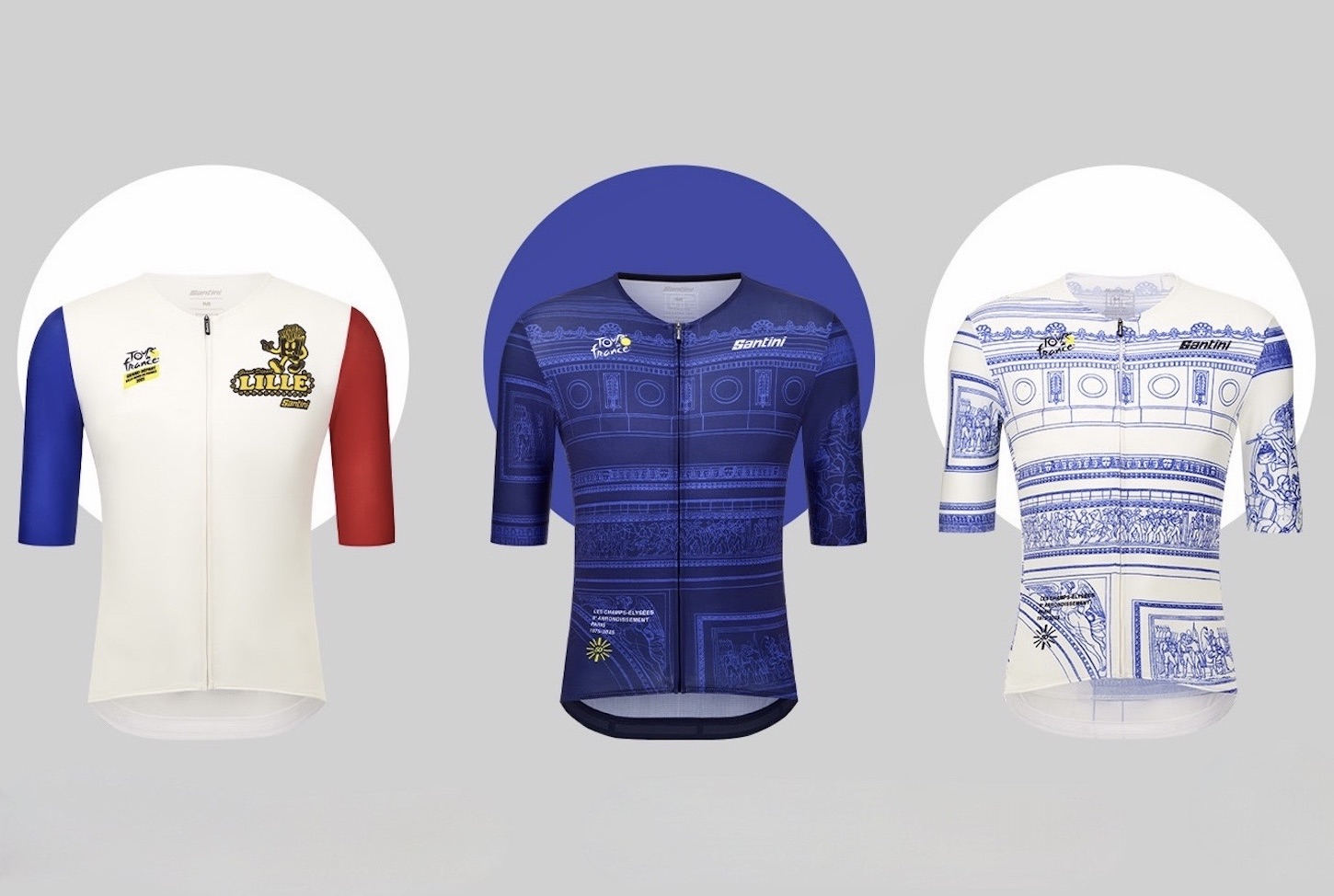 The 2025 Tour de France will kick off in Lille, with Santini paying tribute to the vibrant city and its cultural heritage. The Grand Départ Lille-Nord de France line features the colors of the French flag — blue, white and red — and nods to the local football team, LOSC Lille, and the region’s culinary traditions, highlighted by a playful graphic of French fries.