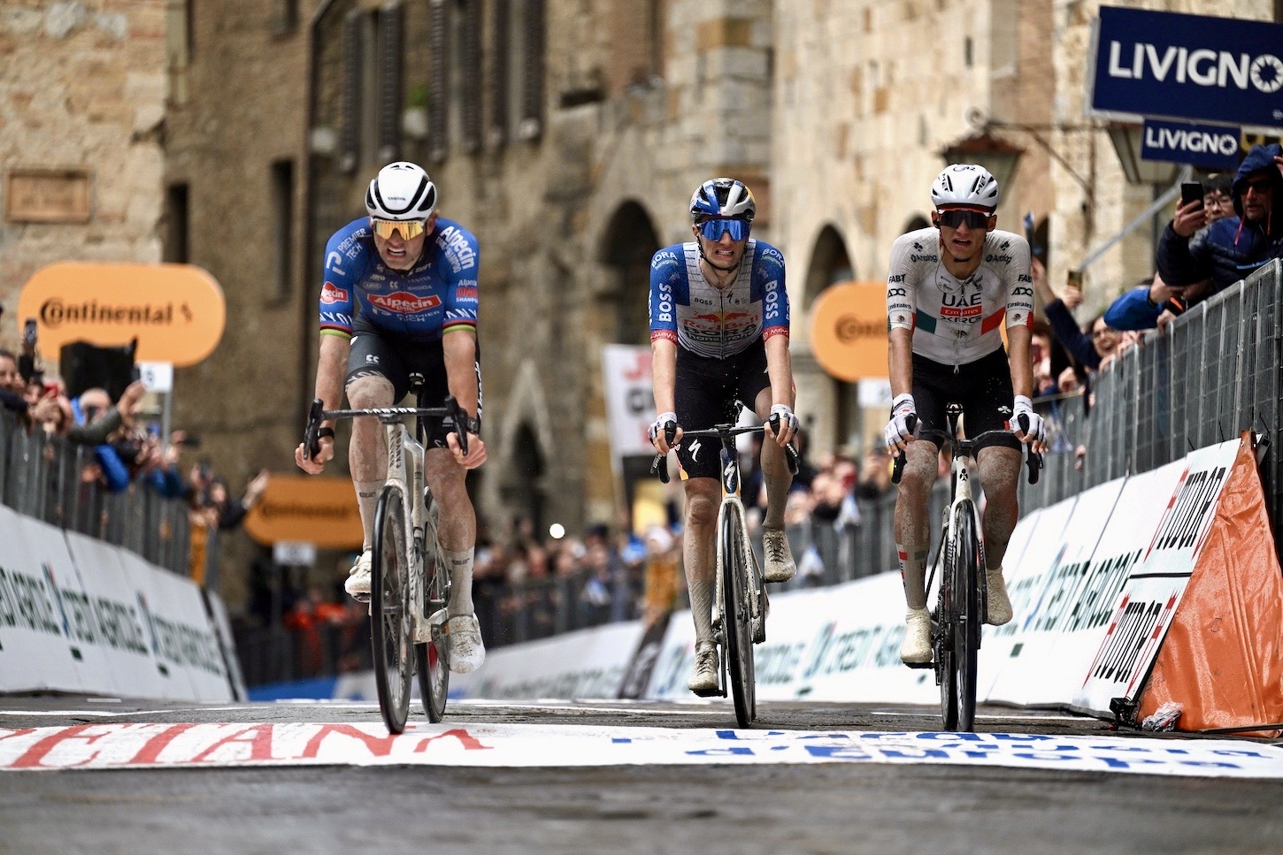 Mathieu van der Poel claimed stage 2 of the Tirreno-Adriatico in San Gimignano today, after powering away along wet gravel roads with Isaac del Toro (UAE Team Emirates-XRG) and Giulio Pellizzari (Red Bull-Bora-hansgrohe) during the last few kilometers, later out-sprinting his rivals on the line in the medieval Tuscan town.