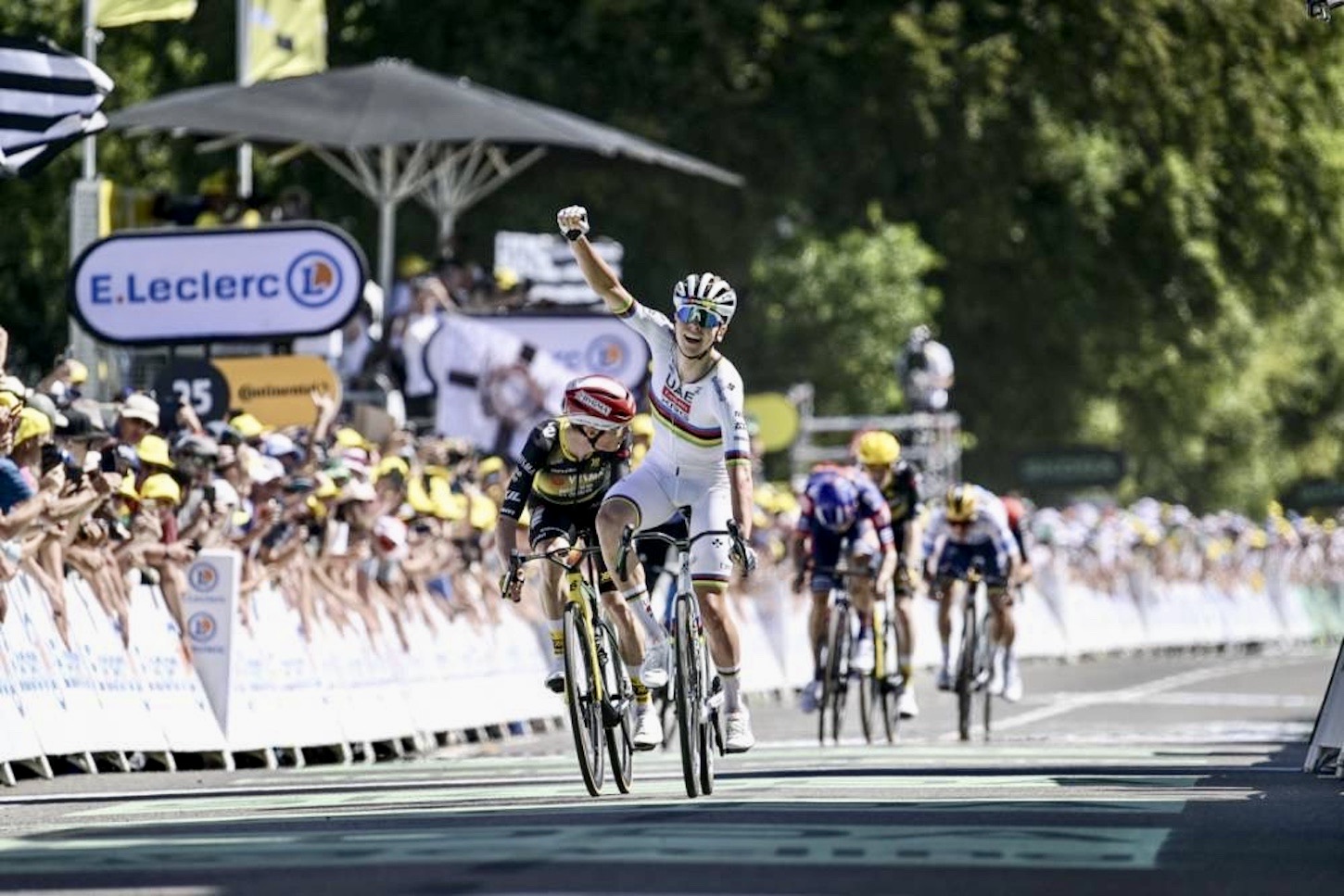 Defending champion Tadej Pogacar (UAE Team Emirates) is back in the yellow jersey after the Slovenian fought off Jonas Vingegaard (Visma–Lease a Bike) to win stage seven of the Tour de France today.