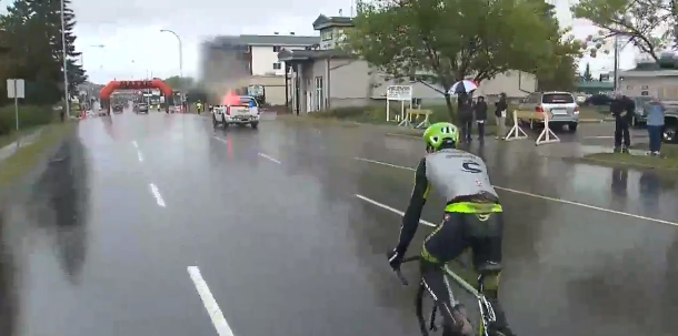 Today’s stage was mostly downhill, in sharp contrast to the previous two stages in and around Jasper, Alta. But the stage also had several dirt sections, originally 56 kilometers of off-pavement riding. But with rain that started Saturday and continued most of today, race organizers dropped the longest section of dirt road. The left the riders to deal with about 21 kilometres of muddy, slippery roads that led to several crashes as riders tried to manoeuvre their way through water puddles and hidden potholes.