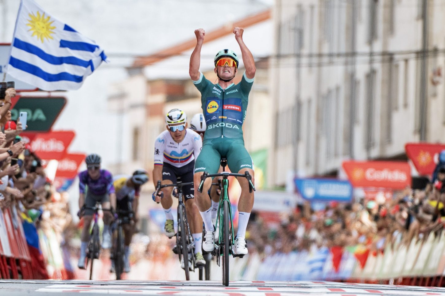 Green jersey holder Mads Pedersen ended his wait for a stage win the Vuelta a España today, with a superb controlled sprint on Stage 15. The Danish star came to the front with a nine-man breakaway in the closing moments and saw off his rivals to cross the line unchallenged. There was little action in the general classification battle with a rest day coming on Monday.