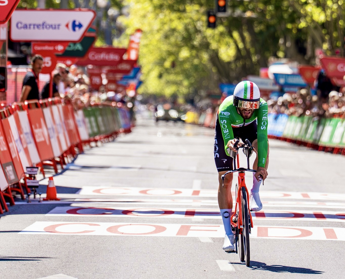 Two-time world champion time trialist Filippo Ganna (Ineos Grenadiers) showed his prowess in today’s stage 18 time trial in Valladolid. The Italian had already won a 25.8-kilometer time trial here in 2023, repeating it today over a shorter distance (12.2 kilometers) with an average speed of 56.2 km/h, taking his eighth Grand Tour individual time trial victory.